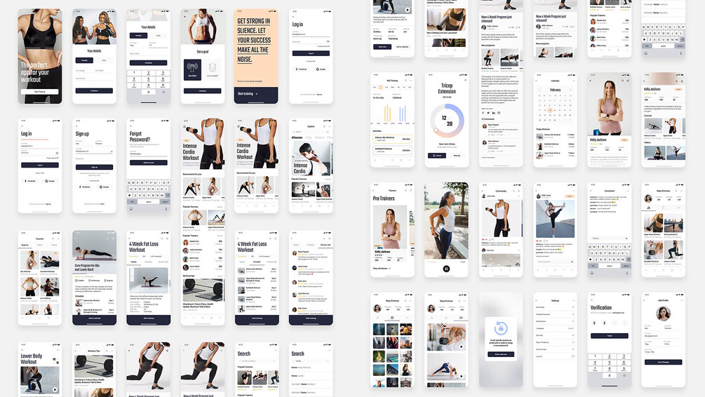 Berlin Fitness App UI Kit is a set of mobile app templates for crafting a stylish, contemporary, and user-friendly fitness app. This template set is tailored for developers and designers, offers all the essential components and features needed to create an engaging and intuitive app interface. All components are fully customisable, allowing you to update with your own content, fonts, and colours.